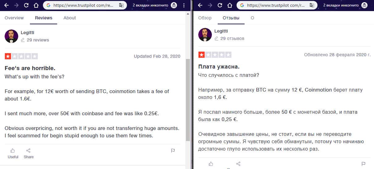 На изображении, расположенном ниже, вы можете наглядно увидеть и прочесть реальный негативный отзыв в сторону мошенников CoinMotion с веб-сайта трастпилот ком, который связан непосредственно с тем, что шулера Коин Мотион попросту завышают процент от сделки без ведома пользователя, тем самым нагло воруя у клиентуры их деньги.