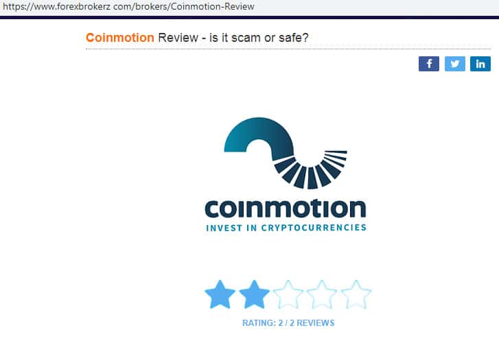 Ввиду крайне сомнительной репутации, а так же мошеннической и противозаконной деятельности лохотрона Коин Мотион на просторах сети интернет веб-сайт форексброкерз ком не рекомендует иметь дело с данной конторой, в связи с чем у лохотрона CoinMotion довольно низкий рейтинг, что вы можете увидеть на изображении, расположенном ниже.