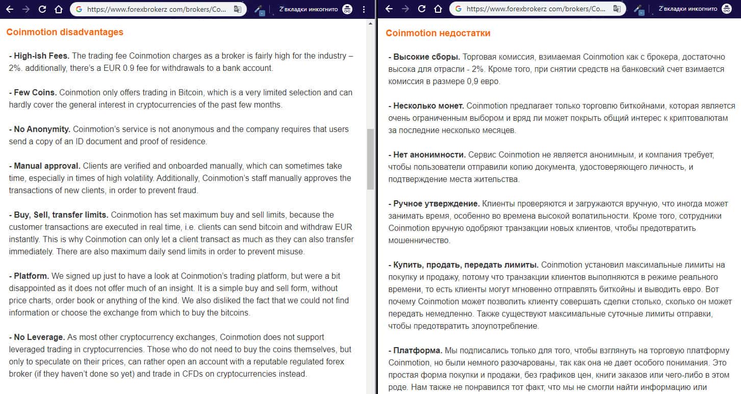 В связи с довольно сомнительной деятельностью аферистов CoinMotion веб-сайт выделил их основные недостатки, с которыми обязательно столкнутся наивные пользователи сети интернет, решившие начать сотрудничать с жуликами Коин Мотион. На изображении, расположенном ниже, вы можете наглядно увидеть информацию о шулерах.