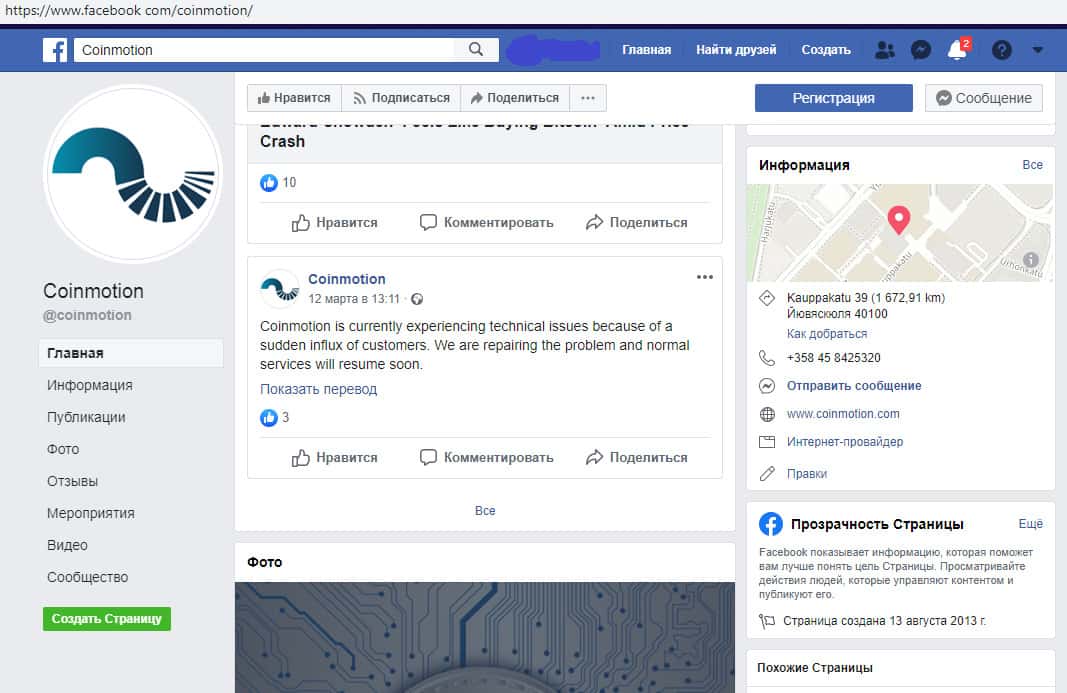 Дабы соответствовать современным трендам шулера Коин Мотион обзавелись страницами в социальных сетях одной из которых является Facebook, где у мошенников CoinMotion имеется около тысячи подписчиков. На изображении, расположенном ниже, вы можете увидеть внешний вид страницы проходимцев Коин Мотион в социальной сети Фейсбук.