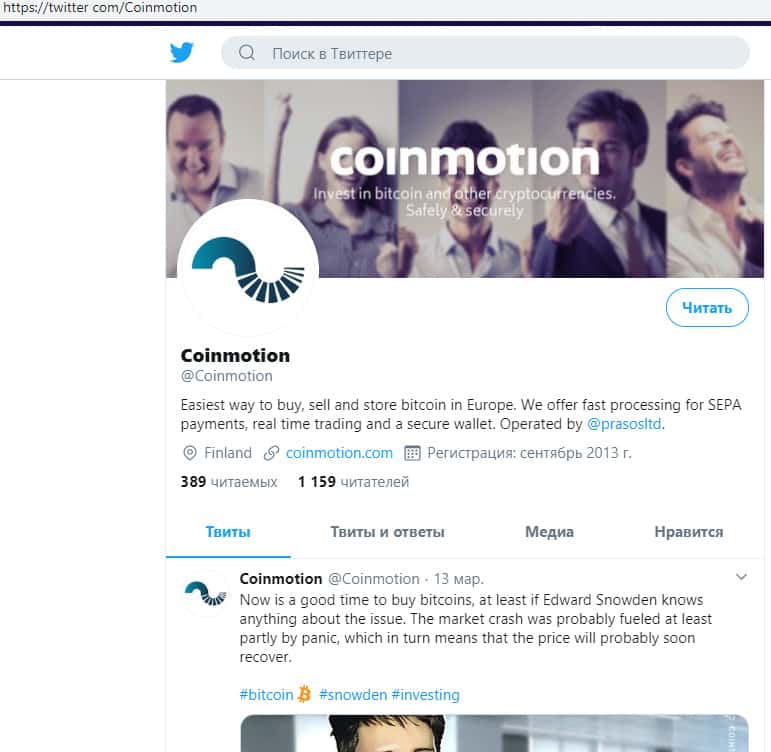 Имеется у аферистов Коин Мотион и страница в социальной сети Твиттер, где у шулеров CoinMotion размещена довольно стандартная и типичная лапша на уши и накручено всего около тысяч подписчиков. На изображении, расположенном ниже, вы можете наглядно увидеть страницу аферистов CoinMotion в социальной сети Твиттер.