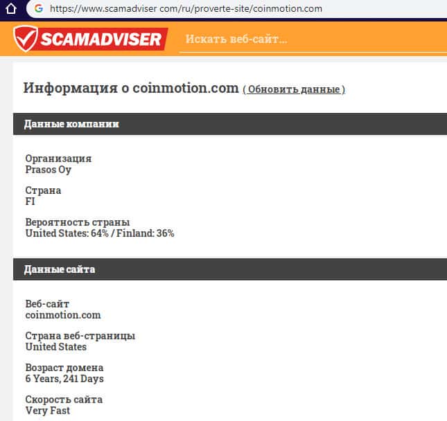 В связи с мошеннической и противозаконной деятельностью лохотрона Коин Мотион его реальные руководители предпочитают анонимность дабы избежать ответственности со стороны правоохранительных органов. Техническую же информацию о сайте аферистов CoinMotion можно узнать с помощью портала scamadviser com, что вы можете увидеть ниже.