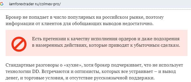 Ссылаясь на мнение уважаемого интернет-сайта iamforextrader ru, можно подтвердить, что у него есть претензии к брокерской компании Колмекс Про по поводу качества исполнения ордеров. Также ресурс сообщает что имеются некие подозрения касательно того, что мошенники Colmex Pro специально приводят сделки клиентов к убыткам.