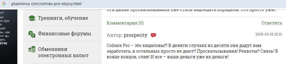 - Еще один отрицательный отзыв о лохотронской организации Colmex Pro
