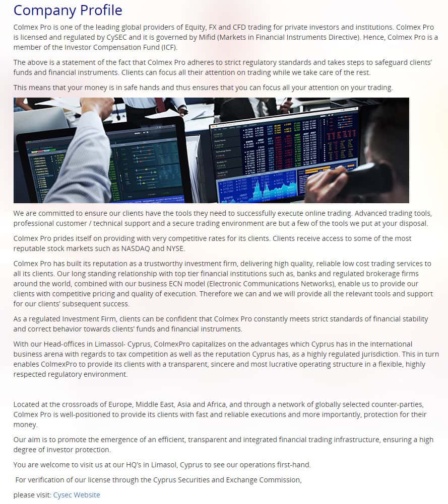 Затем можно перейти в раздел веб-страницы Колмекс Про "Профиль компании", который пестрит информацией о надежности и благосостоянии организации, о стопроцентной гарантии торговли и прибыли клиентов. В общем, красивые слова, благодаря которым жулики из брокерской компании Colmex Pro пытаются кидануть своих вкладчиков.