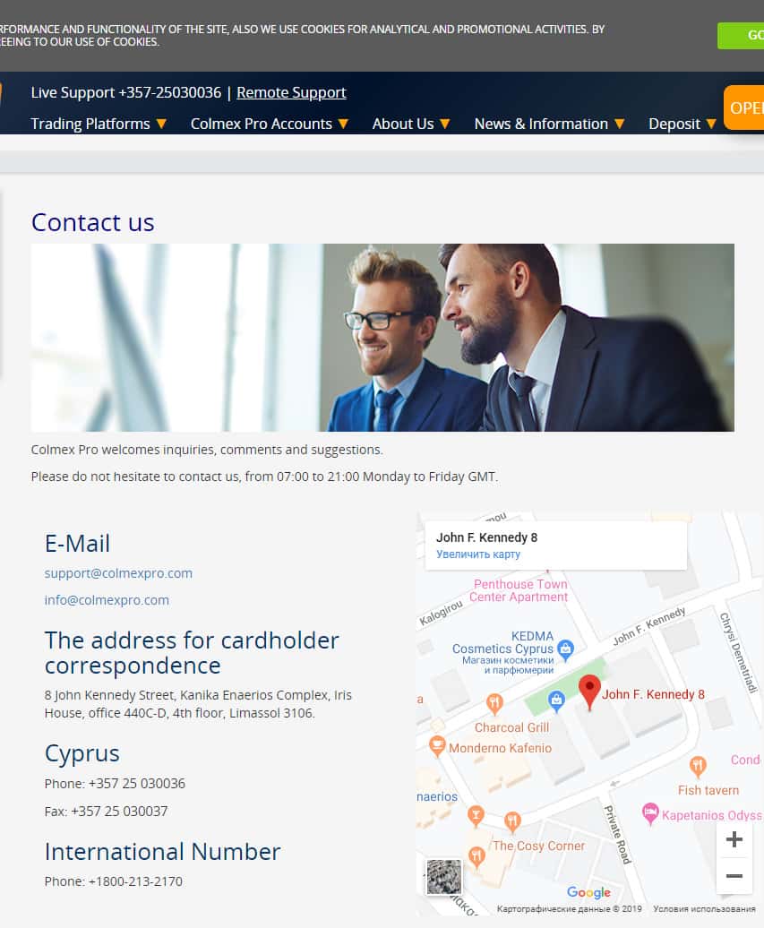 Для всех, кто захочет изъявить желание пообщаться с представителями жуликовской конторы Colmex Pro, мошенники разместили на своем веб-сайте, как почту и телефон, так и адрес нахождения главного офиса. Но минус в том, что аферисты будут морозиться и сливаться, когда кинут Вас на деньги. Контакты ворюг: