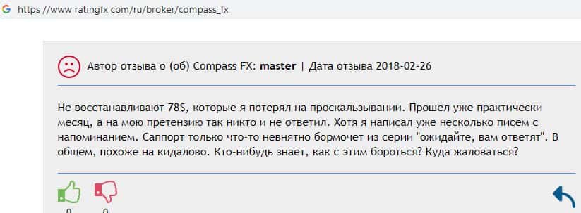 На скриншоте, расположенном ниже, мужчина поделился своей историей о том, что ему не восстанавливают 78$, которые он потерял на проскальзывании. Отдел технической поддержки веб-сайта аферной брокерской конторы CompassFX вообще не реагирует на все заявки обманутого клиента. Явно, эти средства навсегда остались у шулерского брокера.