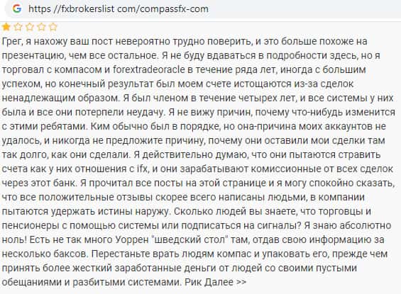 На скриншоте, расположенном ниже, можно ознакомиться с детальным отзывом бывшего трейдера махинаторской брокерской компании CompassFX , который рассказывает о том, что сотрудничая на протяжении долгого периода времени нес только постоянные убытки на этой торговой платформе, чего не было с другими форекс компаниями.
