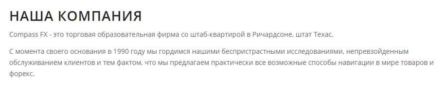 Далее можно перейти в раздел веб-страницы аферного брокера CompassFX "Наша компания", в котором жулики занимаются яркой самопрезентацией, нахваливая себя тем, что их компания существует на форекс рынке с 1990 года, и они гордятся беспристрастными исследованиями, непревзойденным обслуживанием клиентов. Жаль, что это обман.