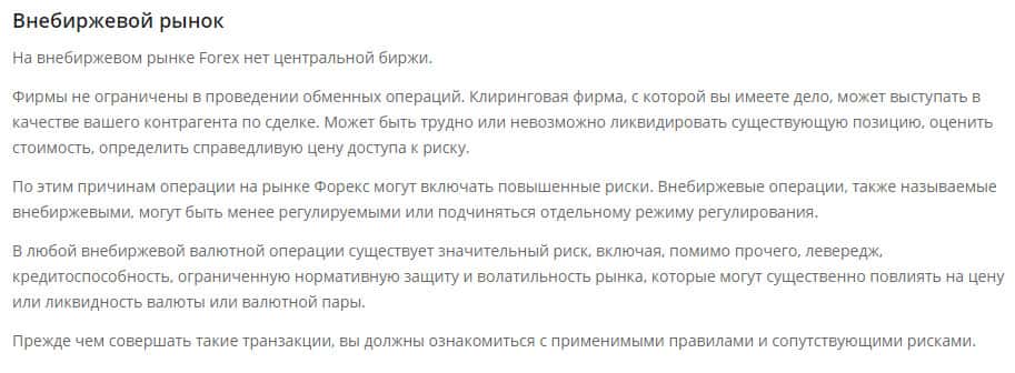 В следующем разделе договора "Внебиржевой рынок" посвящен тому, что воровская контора Компас ФХ предупреждает о том, что операции на рынке Форекс могут включать повышенные риски. Поэтому, нужно очень осторожно вести торговлю на внебиржевом рынке. Но по отзывам бывшим клиентов главным врагом является сам мошенник CompassFX .