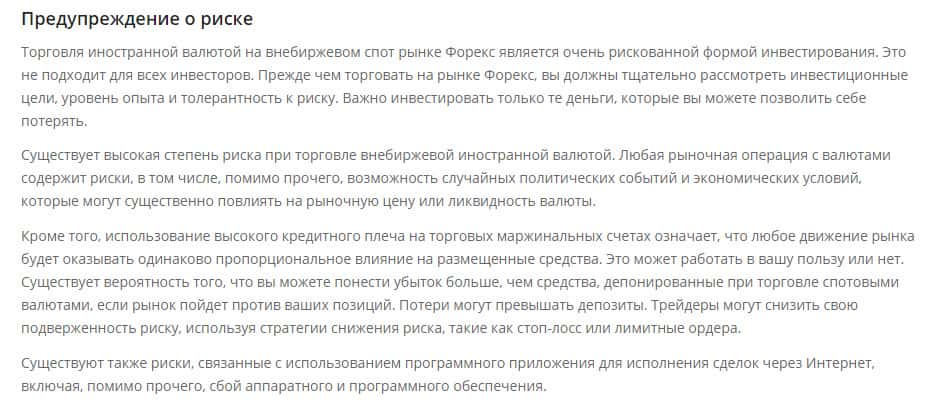 Далее переходим к разделу "Предупреждение о риске", в которой проходимцы из жульнической компании CompassFX предупреждают всех трейдеров о возможных рисках. Речь идет о том, что нужно понимать, что Вы можете уйти в минус, а не заработать на форекс рынке. Жаль, не указывают, что главный риск - это торговля с самим этим воровским брокером.