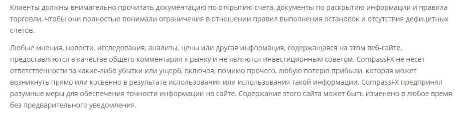 В разделе "Отказ от ответственности" сообщается, что по настоянию клиента информация о нем не будет разглашаться левым лицам, но при этом в любой момент мошенники из шарашкиной конторы Компас ФХ могут изменить это, а вот узнает об этом сам клиент, стоит только догадываться, ведь отзывы о них свидетельствуют о полном сливе.