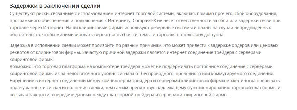 Последним разделом договора является "Задержки в заключении сделки", в котором идет речь о том, что махинаторы из липовой брокерской компании CompassFX предупреждают о возможных задержках в исполнении сделки. А по факту, при обращении к ним за помощью, проходимцы из конторы Компас ФХ просто сливаются с награбленным без веских объяснений.