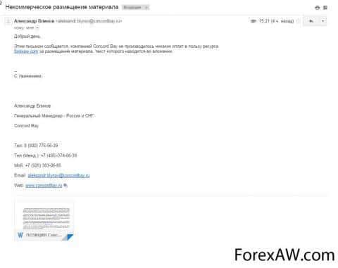 - Позиция Администрации ForexAW.com по реакции от Concord Bay