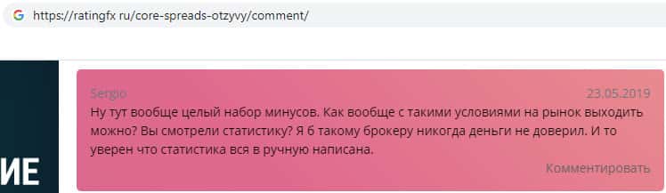 Клиент пишет негативный отзыв о компании жуликов Кор Спред. он указывает, что в компании сплошные минусы. Он удивляется, как с условиями которые предоставляют аферисты Кор Спред вообще можно выходить на торговый рынок, и призывает всех посмотреть статистику компании, добавив, что статистика мошенников может быть написана вручную.