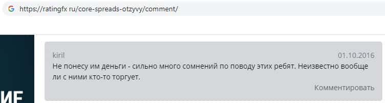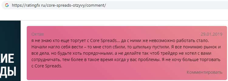 Пользователь охарактеризовал компанию Core Spreads как "маркет-мейкер", и заявил, что они торгуют против клиента, ,и привёл ряд доказательств. Жулики тянут с исполнением заказов, так же они предоставляют клиентам не точные диаграммы, котировки не всегда правильные, но главное то, что они отказываются выводить средства со своих счетов.