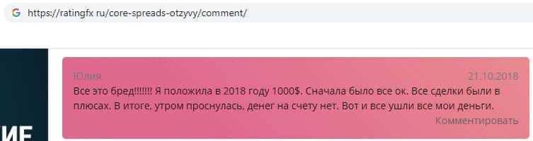 Клиент лохотрона Кор Спред рассказал историю о том, как его кинули на 1000 долларов. Пользователь сначала внёс 1000 долларов, и начал торговать, торги шли успешно, почти всегда был плюс, но в один момент клиент зашёл на сайт компании и обнаружил, что денег на счету нет. Жулики просто присвоили их, и теперь клиент их никогда не увидит.