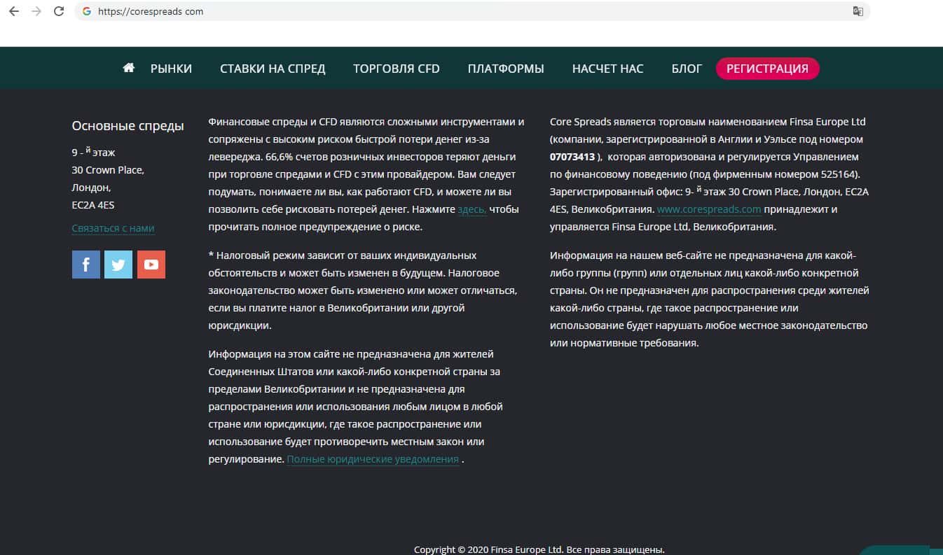 Завершает сайт мошенников Core Spreads раздел с информацией, в которой присутствует часть информации о регистрации, так же присутствует отказ от ответственности. То есть компания сразу снимает с себя всю ответственность, и часть контактной информации. Сайт компании не несёт никакой информации, просто пустые обещания.