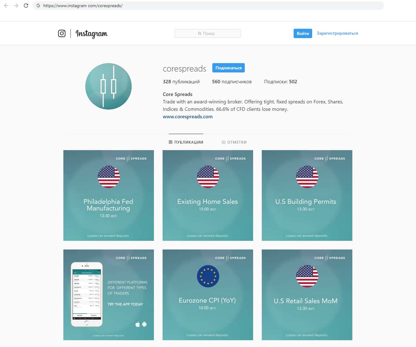 Так же есть страница в инстаграмме, там аферисты продвигают свою страницу, и уже набрали более 500 подписчиков. Компания хочет завлечь в свои сети как можно больше клиентов. Мы будем надеяться на то, что пользователи будут благоразумны и не поведутся на всю пропаганду от псевдоброкера Core Spreads.