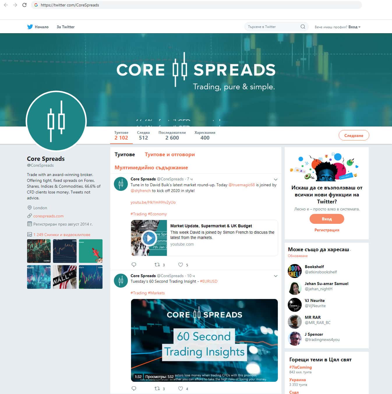 Кидалы Core Spreads создали страницу в твитере. Это социальная сеть для обмена короткими сообщениями. Там они продвигают свой лохотрон и ищут новых жертв, с которых можно вытащить деньги, так как опытные трейдеры не будут сотрудничать с данной компанией, и сразу разоблачат жуликов, под видом брокера.