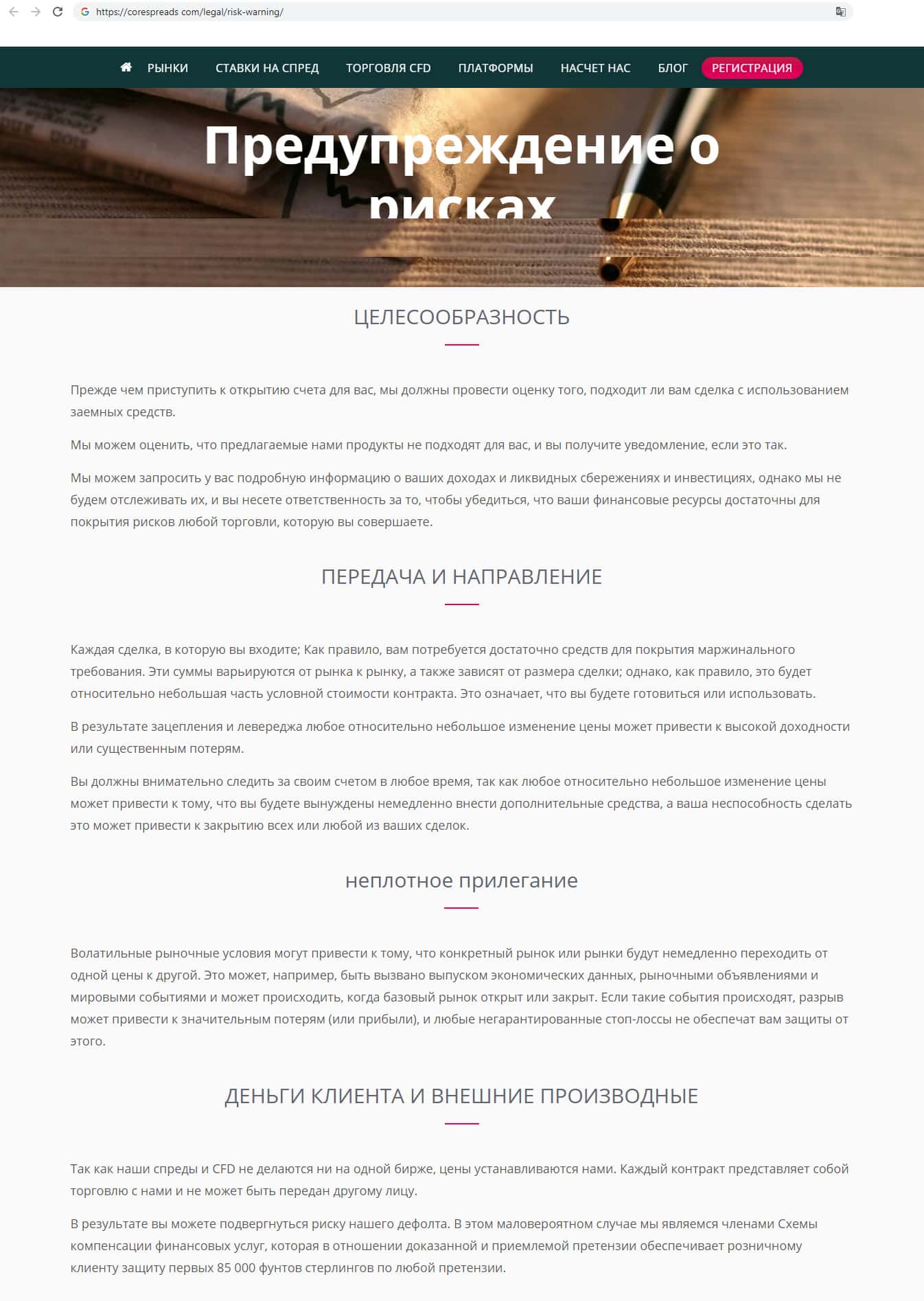 Псевдоброкер Core Spreads предоставил предупреждение о рисках