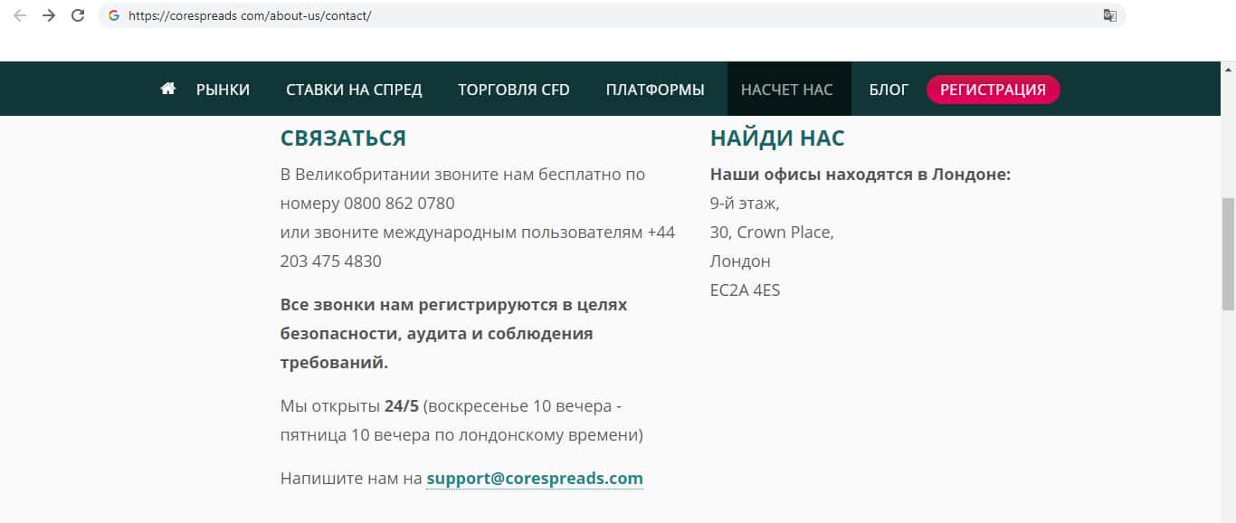 Аферисты указали контактные данные своей организации. В ней были указаны номера телефонов, адрес электронной почты и местонахождение главного офиса лохотрона Core Spreads. Но как было сказано в отзывах на телефон компания не отвечает, на письма тоже редко. Контакты мошеннической организации Core Spreads: