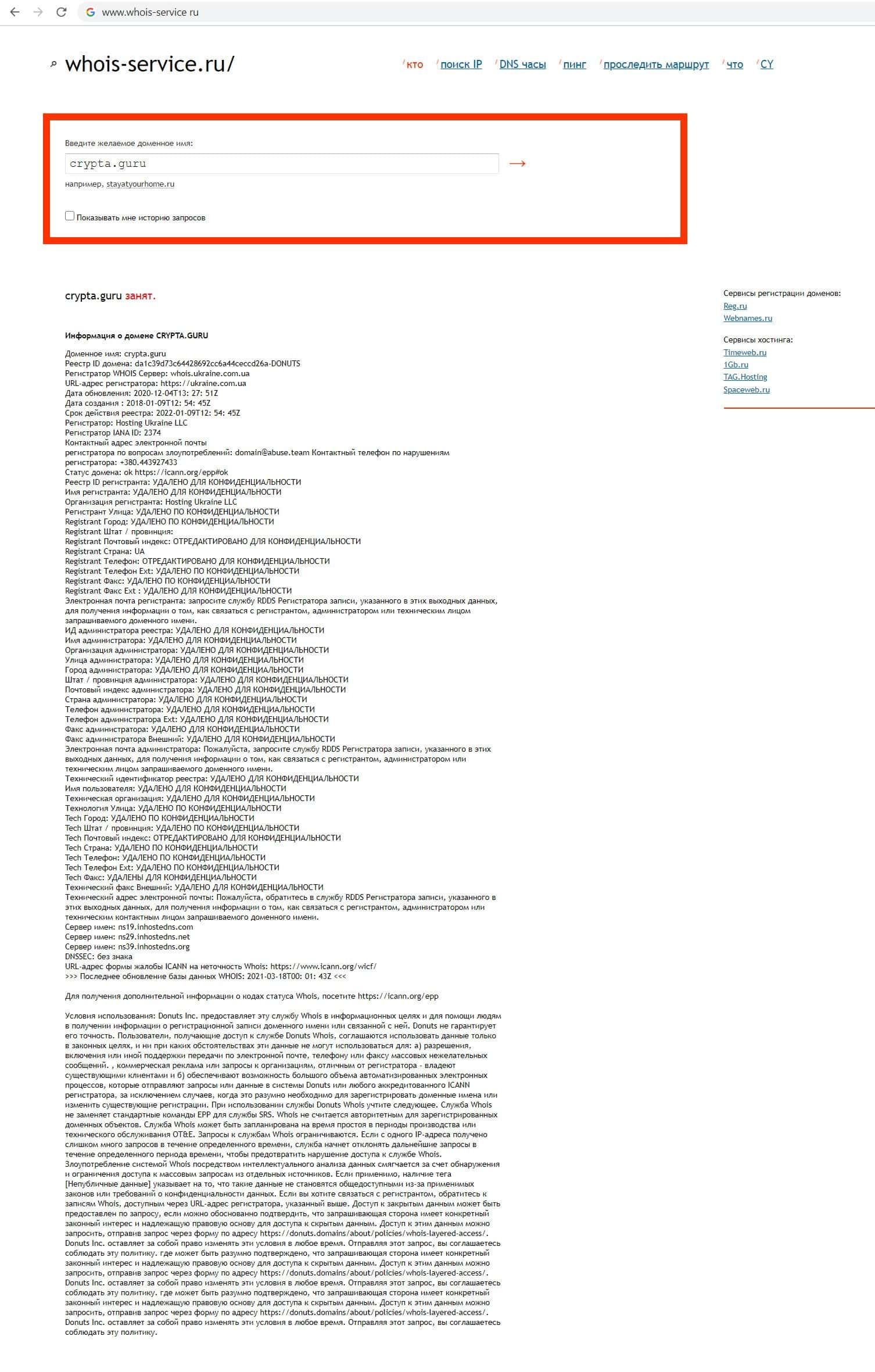 С помощью сайта whois-service ru мы решили узнать владельца доменного адреса разводил Crypta Guru, но оказалось, что кидалы скрывают эту информацию от пользователей.