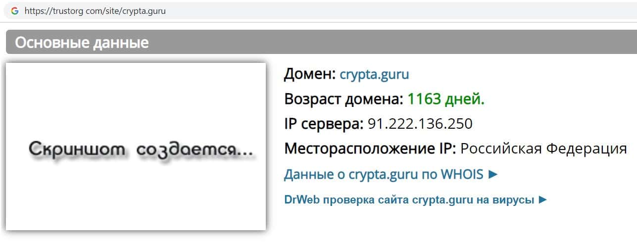 - Информация о возрасте главного сайта мошеннического отзовика Crypta Guru