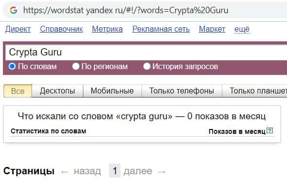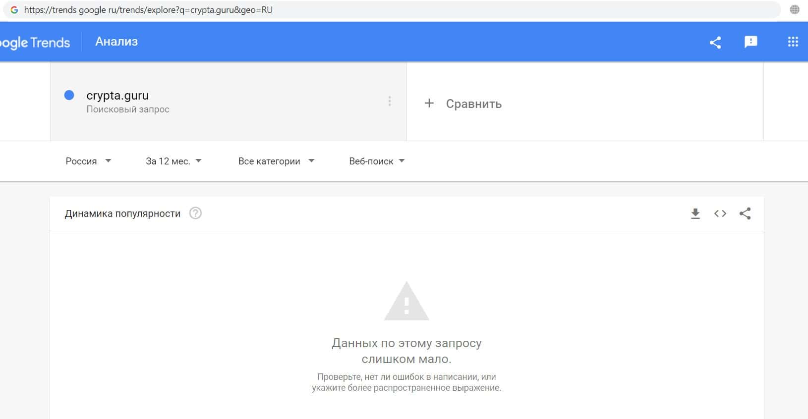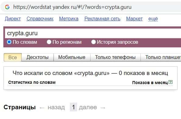 Напоследок мы решили проверить количество запросов компании финансовых кидал Crypta Guru по домену фирмы с точкой, а именно "crypta.guru", но результата - нет.