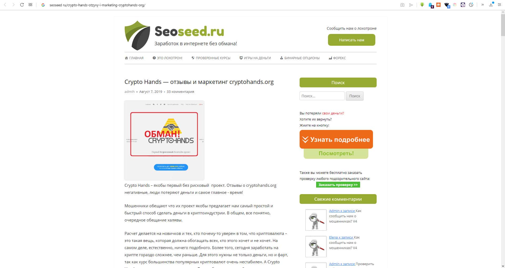 - Портал seoseed рассказывает о мошеннической кухни Крипто Хэндс
