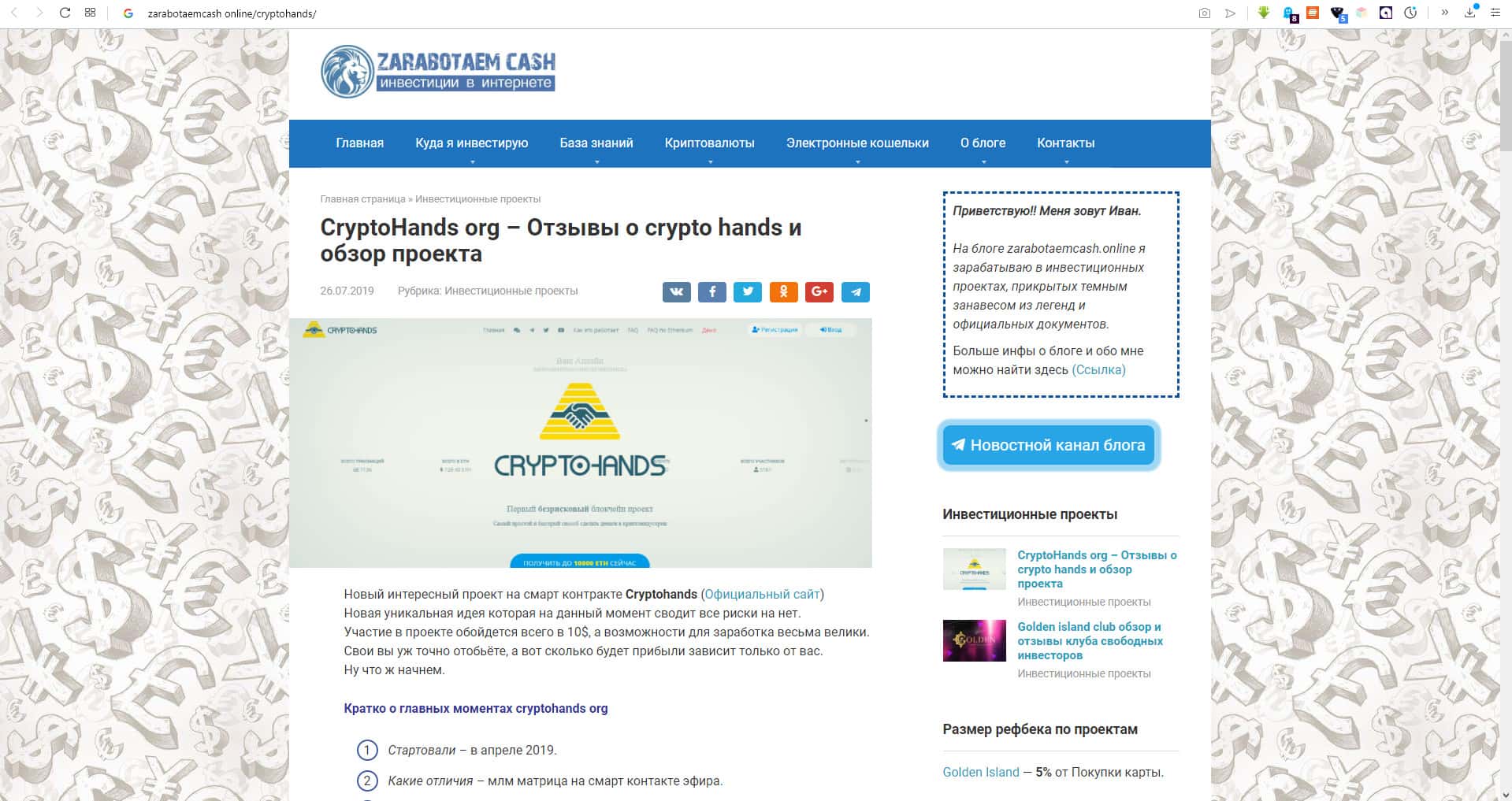 На портале, связанного с продвижением всяких лохотронов-диллинговых центров, zarabotaemcash online рассказывается о прибыльности работы в проекте CryptoHands, который якобы знаменит своей надежностью и популярностью, несмотря на то, что проект недавно только заработал, что говорит о своей профнепригодности.