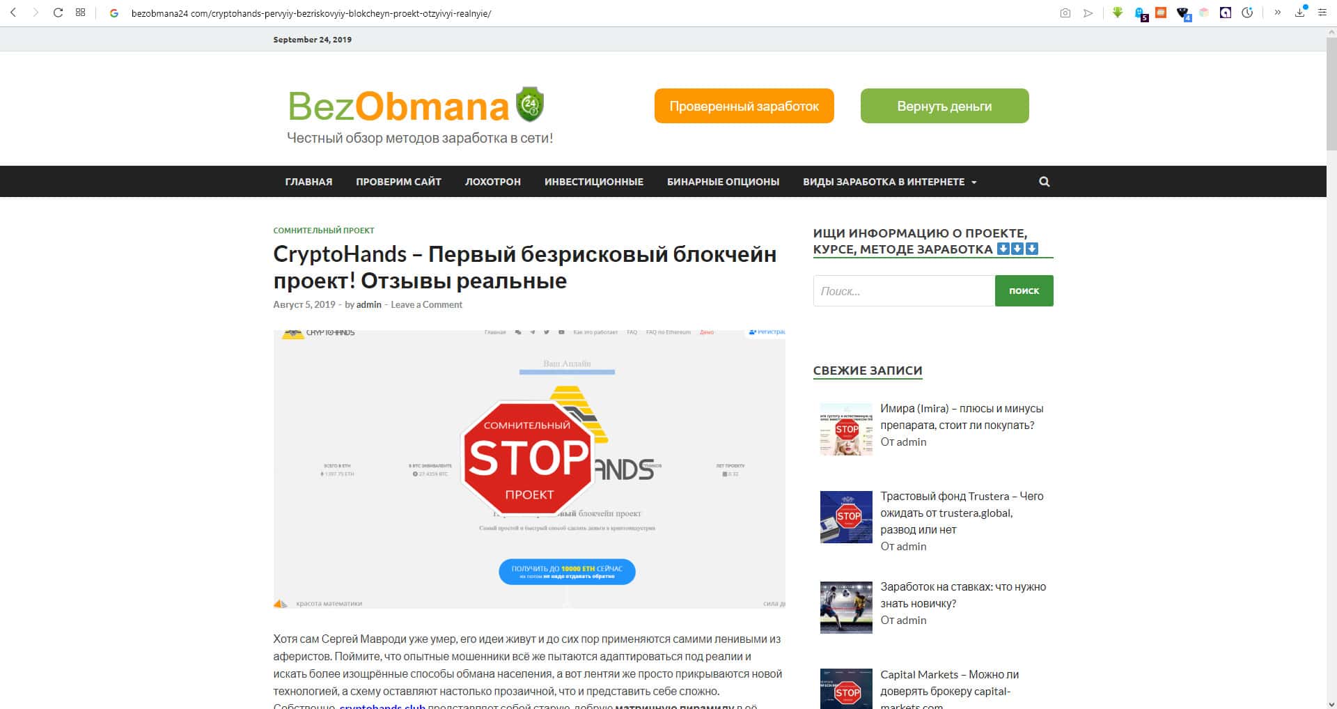 - Рецензия на портале bezobmana24 на сайт мошенничества CryptoHands