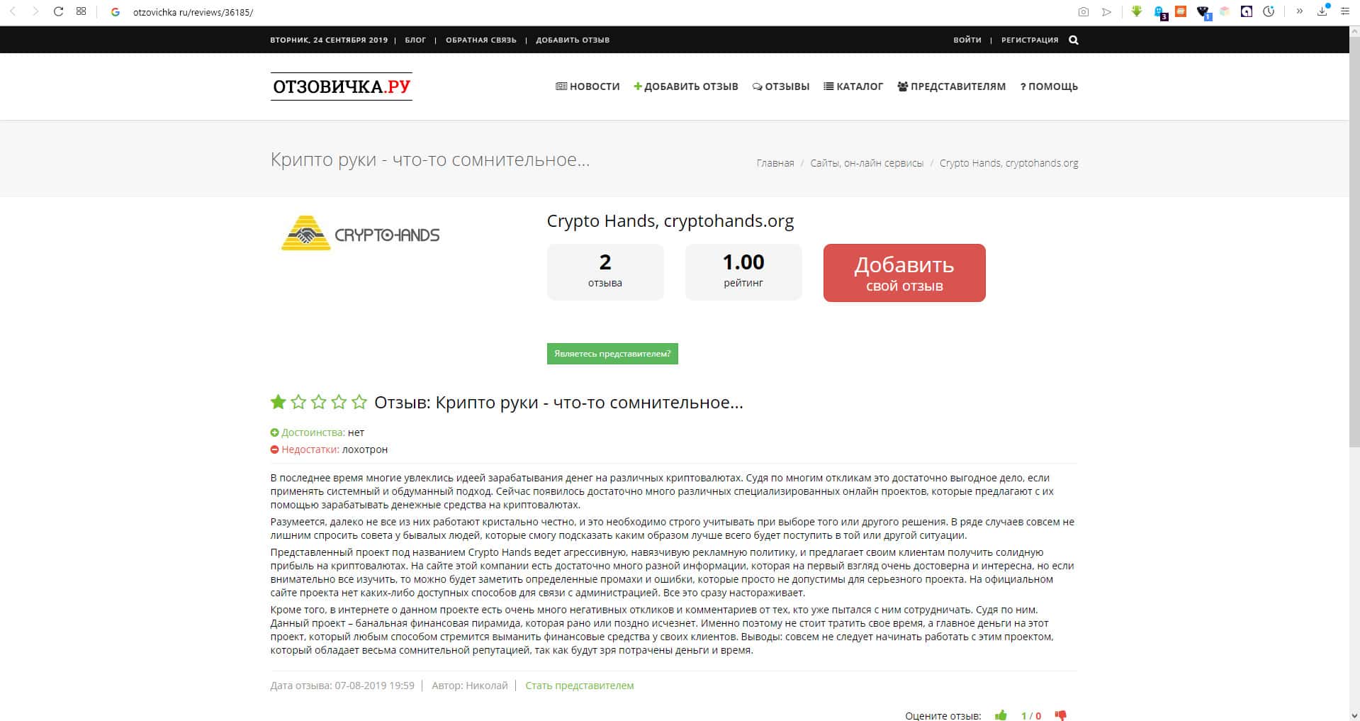 На портале сеосид ру можно найти статью, в которой описывается работа на портале Крипто Хэндс. Автор статьи об этой конторе сильно резко отзывается в сторону этого лохотрона, так как он сам не переносит всяких мошеннических схем и контор. Это просто подтверждение тому, что Крипто Хэндс - лохотрон.