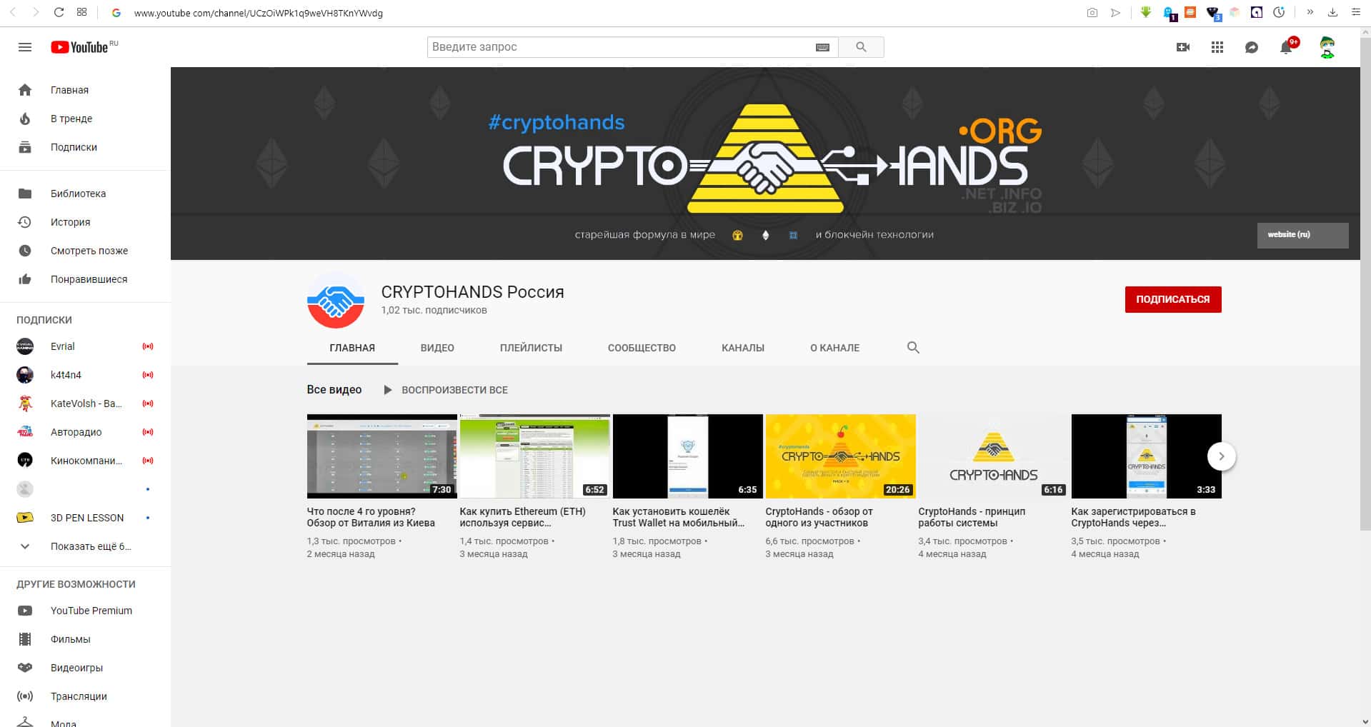 - Канал КриптоХэндс с численностью подписчиков 10к подписчиков на YouTube