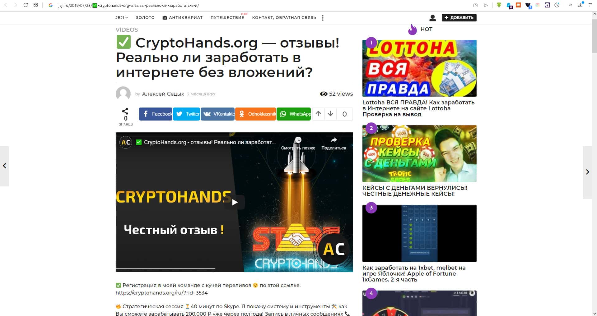На сервисе jeji ru находится очерк с криками о надежности и выгодности работы с порталом CryptoHands, где автор рассказывает о том, как он "поднялся" на этом сервисе и да, многие поднялись на этом сервисе, те кто владеет этой конторой, афферисты и воры, а в конце Вам даже предлагается зарегистрироваться по рефферальной ссылке.
