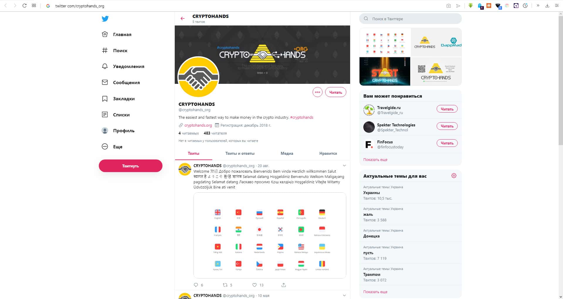 КриптоХэндс позаботилась об создании и поддержании страницы своей компании в социальной сети Twitter, которая имеет большую популярность среди населения всего мира, причем на данной странице, КриптоХэндс насобирала почти 500 читателей, которые наверное ещё не знают о мошеннических действиях этой кухни.