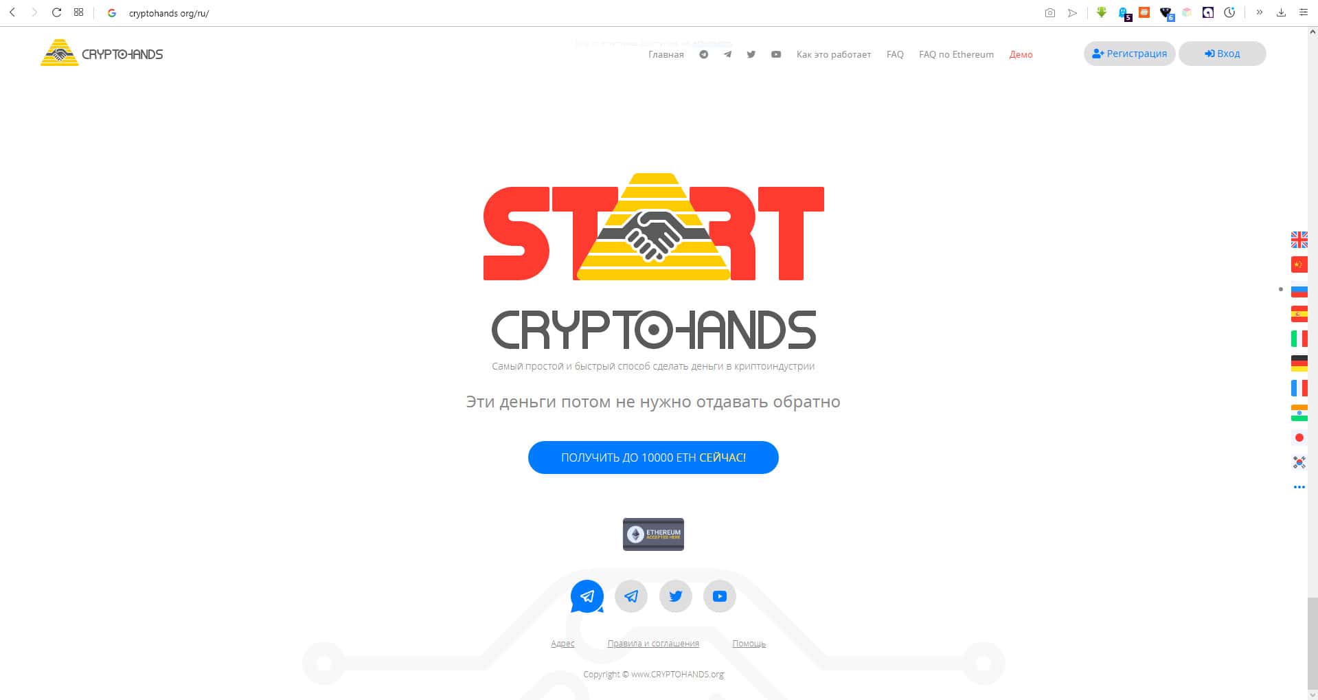 CryptoHands - типичный лохотрон, представляющий из себя финансовую пирамиду. Эти мошенники затягивают к себе людей обещая им баснословные прибыли, но в итоге оставляют их без денег вообще. Ни в коем случае не ведитесь на развод со стороны CryptoHands.