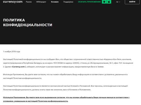 Политика конфиденциальности так же не несет в себе никакой смысловой нагрузки и просто говорит о том, что мошенники Карренси Ком собирают личную и персональную информацию своих клиентов, а они фактом использования сайта шулеров Currency Com. Соответственно ничего интересного в политике конфиденциальности жуликов Карренси Ком.
