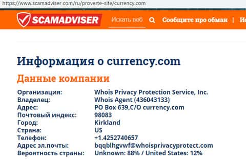 В связи с мошеннической и противозаконной деятельностью руководители лохотрона Currency Com предпочитают анонимность дабы избежать ответственности со стороны правоохранительных органов. С этой же целью мошенники Карренси Ком скрывают реальное местоположение своего подвального сайта, узнать о чем можно с помощью портала scamadviser com.