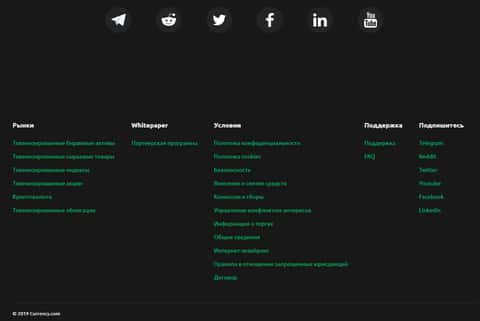 Завершается сайт у мошенников Currency Com стандартным окончанием сайта, в котором у аферистов Карренси Ком имеется меню со ссылками на различные разделы подвального сайта, а так же предупреждением о том, что местная торговая валюта не является какой-либо ценностью. На изображении ниже вы можете увидеть окончание сайта жуликов Currency Com.
