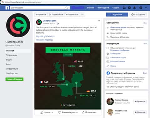 Дабы соответствовать современным трендам мошенники Карренси Ком обзавелись страницами в различных социальных сетях, одной из которых стал Facebook. Данная страница аферистов Currency Com в социальной сети Фейсбук имеет всего несколько сотен подписчиков, а вот активности их на ней абсолютно нету, что вы можете увидеть на изображении ниже.