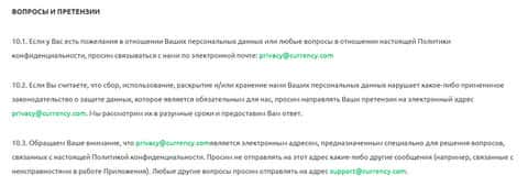 - почты privacy@currency com и support@currency com