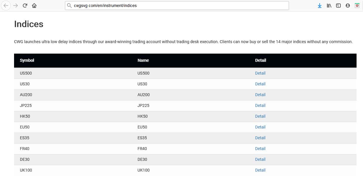 Среди инструментов торговли у жуликов ЦВГ Маркетс есть также торговля индексами. И предлагают они аж 14 основных индексов без комиссии. Конечно, это тоже очередной развод, чтобы к ним шло как можно больше клиентов разного сегмента, которых они потом смогут развести на деньги.