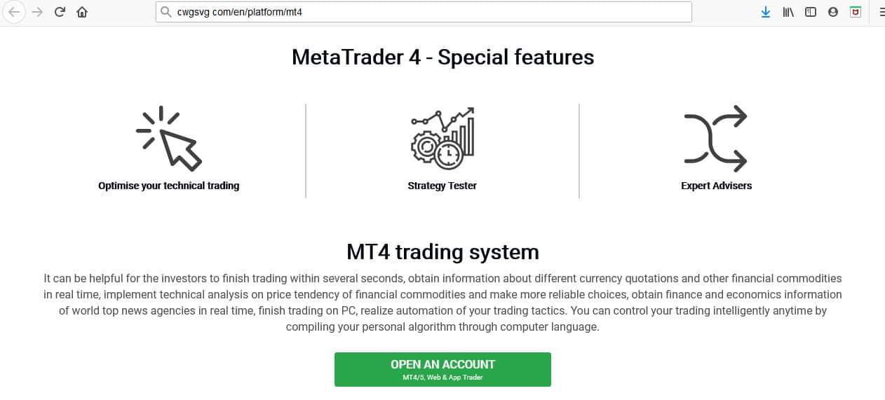 MetaTrader - основная платформа, которая используется брокерскими компаниями. Но увы, ее используют не только порядочные компании и банки, но и разного рода аферисты. CWGSVG тоже не остались в стороне от этого. Типо мы солидная компания, которая предлагает вам торговать через известную во всем мире платформу.