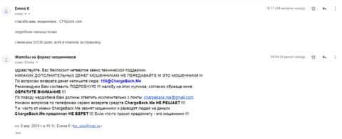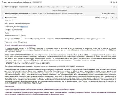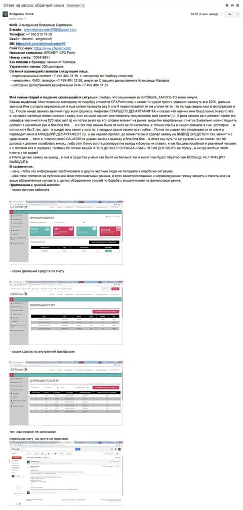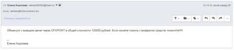 Просьба оказать помощь в возврате утраченный суммы в размере 120 000 рублей пришла на почтовый адрес данной интернет-площадки от очередного пострадавшего клиента жульнической организации ЦФХ Поинт. Этот пользователь сети Интернет достаточно кратко описал свой опыт сотрудничества с этим мошеннически ДЦ в собственной жалобе, заявив лишь о том, что его кинули аферисты в лице компании CFX Point в период попыток вывести средства из кухни.