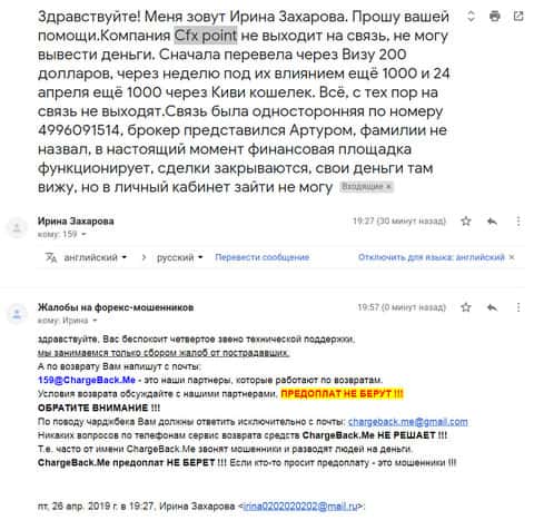 Человек рассказал, как жульбаны брокерской конторы CFX Point обворовали его и отказываются теперь с ним общаться. Компания ChargeBack.Me готова взяться за любой такой вопрос и рассмотреть его с профессиональной точки зрения. Да бывают такие случаи, когда человек ошибся с компанией в процессе инвестирования средств, а таких кухонь намного больше чем чем добросовестных.