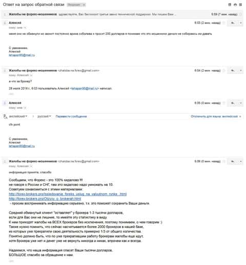 Обычно форекс-жулики работают так: если они чувствуют, что клиент начинает жать вкладывать еще, то они перестают с ним общаться и блокируют счет. Так получилось и с одним человеком, который к нам прислал письмо. Лохотрон CFX Point заманил новоиспеченного клиента звонарями, которые обещали раздуть депозит в десять раз, а то и больше. Человек повелся и вложил 1000 долларов. Потом череда успешных сделок, давление аналитика, верификация счета и прочие штучки, которые не увенчались успехом, чтобы урвать еще кусочек с кармана клиента. Потом клиент сделал роковую ошибку и попросил вывести свои деньги, на что ему ничего не ответили и перестали отвечать на звонки и письма вообще. Как бы он не пытался достучаться до них, все безуспешно. Видимо обиделись жулики-аферисты, так как украсть у него уже было нечего.