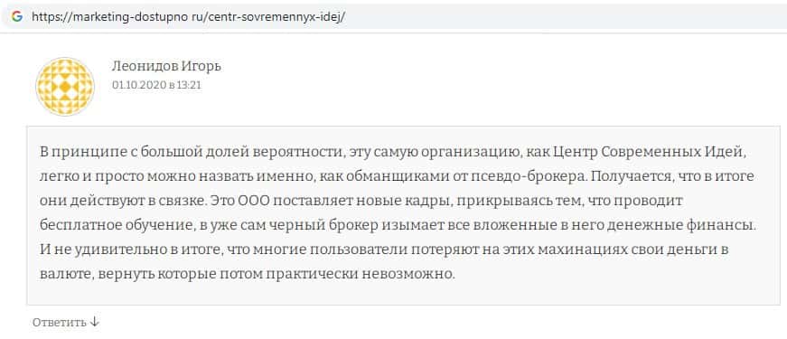 - Обманщики Центр Современных Идей действуют сообща со скам-брокерами
