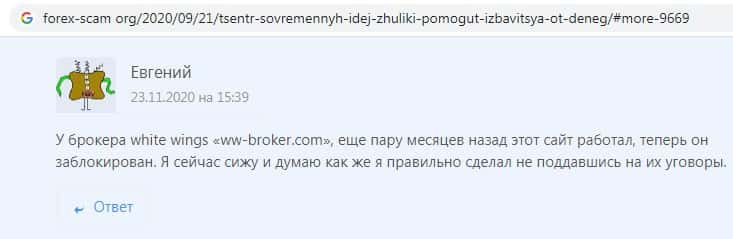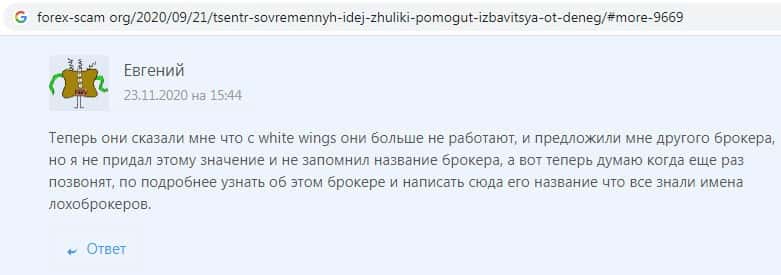 Во всемирной паутине найден пользовательский отзыв подтверждающий то, что мошенники CMIdeas работают в одной связке с псевдо-брокерами, в частности с White Wings Broker.