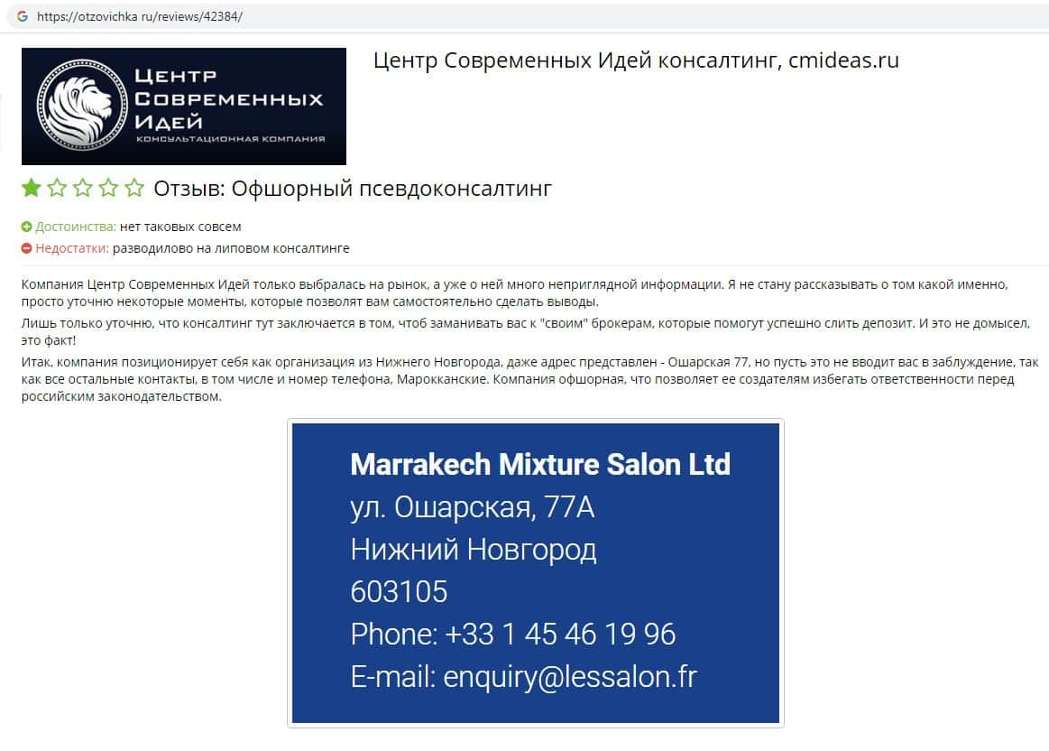 Судя по пользовательским отзывам шарага Центр Современных Идей изменила контактные данные своей конторы, что является свидетельством того, что вся информация липовая.